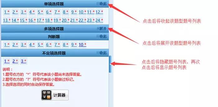 1、根據(jù)考試科目不同,試題類型分為單項(xiàng)選擇題、多項(xiàng)選擇題、判斷題、不定項(xiàng)選擇題。題號(hào)右方的“*”號(hào)表示該小題還未作答,“?”號(hào)表示該小題做過(guò)標(biāo)記。考生可以通過(guò)題號(hào)列表查看本考試科目全套試卷的作答情況(包括每道試題的已答或未答狀態(tài)、標(biāo)記狀態(tài)),還可點(diǎn)擊各題號(hào)按鈕,直接進(jìn)入各試題進(jìn)行答題或檢查。