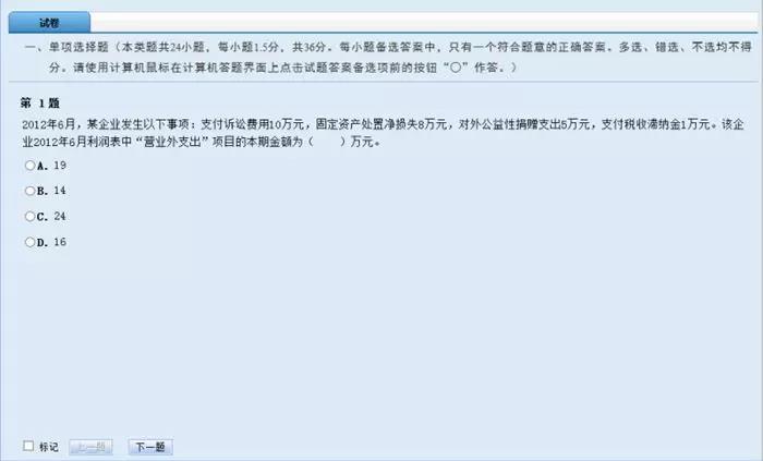 對(duì)試題所作的標(biāo)記,不會(huì)被作為答題結(jié)果,也不會(huì)影響考生的成績(jī)?cè)u(píng)判。考生如合理使用試題標(biāo)記功能,可以在大量的試題中快速查找到需要重點(diǎn)檢查的試題。系統(tǒng)顯示本考試科目剩余時(shí)間,目的是提示考生合理控制答題進(jìn)度。