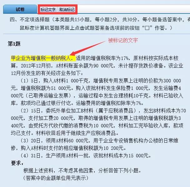 (3)用鼠標(biāo)在題干區(qū)選中文字(包括數(shù)字、符號(hào)、算式、會(huì)計(jì)分錄等,下同)后,再用鼠標(biāo)點(diǎn)擊“標(biāo)記文字”按鈕(如圖紅框處)對(duì)選中部分的文字加上高亮標(biāo)記,可以將試題中重要的信息突出顯示,方便查看。