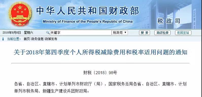 - 9月8日,財政部、稅務(wù)總局印發(fā)《關(guān)于2018年第四季度個人所得稅減除費用和稅率適用問題的通知》,明確了關(guān)于工資、薪金所得適用減除費用和稅率問題。