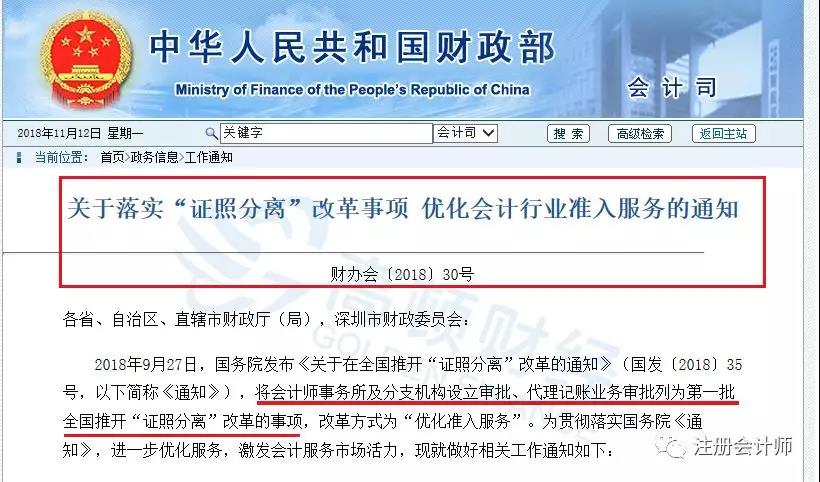 11月9日,財(cái)政部公布了一項(xiàng)文件:《關(guān)于落實(shí)“證照分離”改革事項(xiàng) 優(yōu)化會(huì)計(jì)行業(yè)準(zhǔn)入服務(wù)的通知》提到將會(huì)計(jì)師事務(wù)所及分支機(jī)構(gòu)設(shè)立審批、代理記賬業(yè)務(wù)審批列為第一批全國(guó)推開“證照分離”改革的事項(xiàng)。